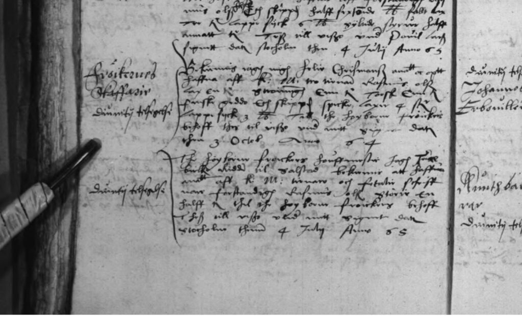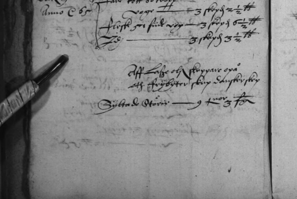 Här framgår uppbörden av stör till Stockholms slott år 1565. ”Av Lasse Olsson skeppare uppå ett fribrytar skepp. Danske skepp – Syltad Störie – 9 tunnor och 3 fjärdingar.