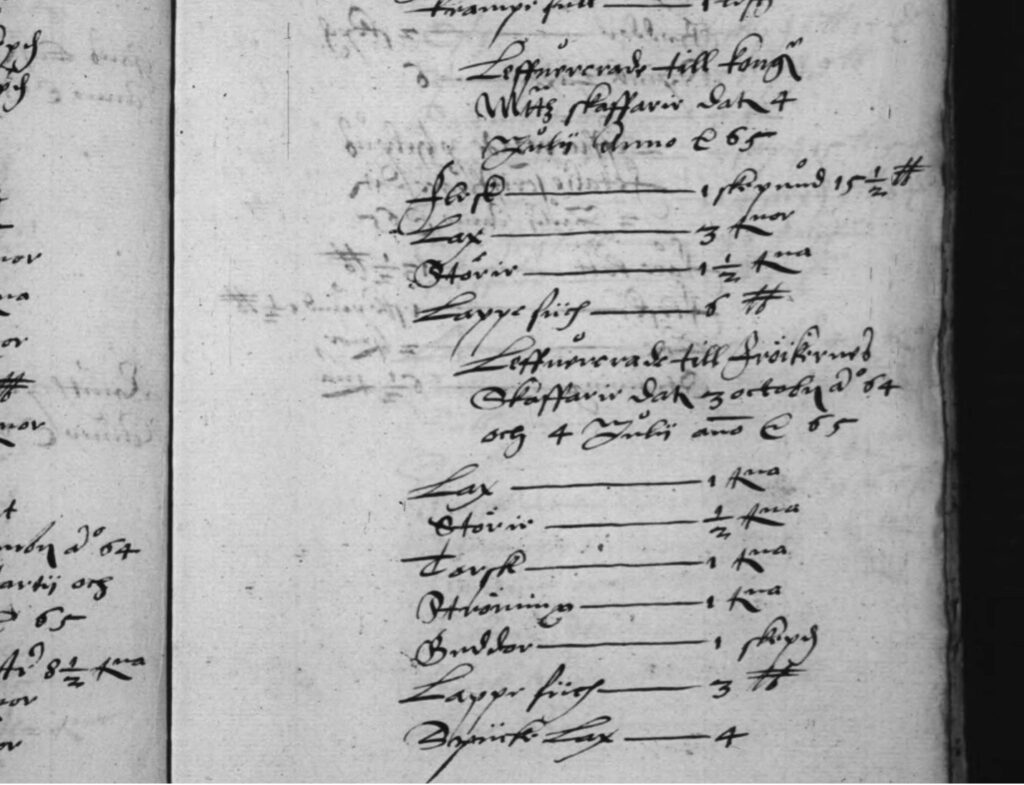 Här syns levereringen av stör till olika mottagare. Överst syns: Levereringen till Kongl. Majt:s skafferi den 4 juli anno -65, dit 1½ tunna stör skickades, tillsammans med fläsk, lax och lappesik ( vi ber om ursäkt för ordvalet, men det är så det står). Under syns: Levererade till Fröknarnas skafferi den 3 oktober – 64 och 4 juli anno -65, där en ½ tunna stör syns på andra raden uppifrån.