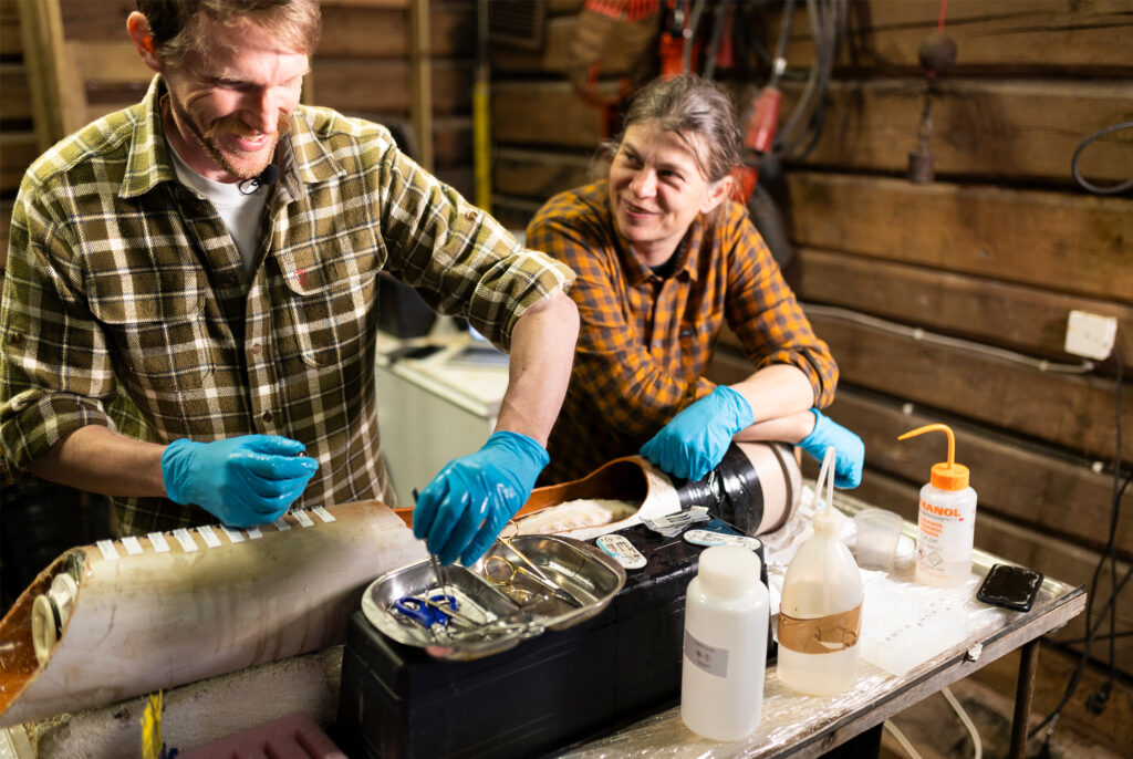 Gustav Hellström (SLU) och Linnéa Jägrud märker stör med akustisk telemetrisändare.